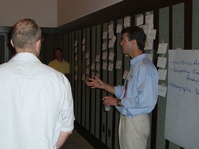 The morning tutorial that I attended was presented by Luke Hohmann of Enthiosys. The topic was “Innovation Games: Creating Breakthrough Products Through Collaborative Play.” The focus of this talk was strategies that can be used to solicit customer input and how to process this data to turn it into innovative products. The techniques consist of games that can be played with small groups of customers in order to understand their wants, needs, and priorities. They have an entire catalogue of games that can be used for various purposes and audiences. During this presentation he went through three of them: Speedboat, Buy A Feature, and Spider Web. The game that I found the most interesting was Buy A Feature. Each customer is given a certain amount of play money and a list of features along with their cost. The customers then get together and decide which features they would like to “buy.” Sometimes features are expensive and a single customer does not have enough to purchase the feature, thus they must collaborate and pool their money together to get what they want. I like this game because it demonstrates the constraints (especially time constraints) that developers have, but it puts control of what goes into the product in the customer’s hands.